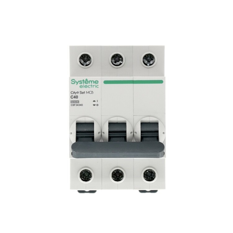 Автоматический выключатель серии City9 Set Systeme Electric, 3-полюсный, номинальный ток 40 А, характеристика С, Icn = 4.5 кА. Применяется в электрических сетях напряжением 400 В. Предназначен для защиты от перегрузок и токов короткого замыкания. Оснащен механизмом «мгновенной коммутации». Ударопрочный корпус из специального пластика с 6 металлическими заклепками. Безопасные клеммы исключают попадание кабелей в заклеммное пространство (ранее Schneider Electric EZ9F34340).
