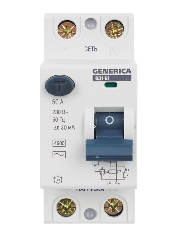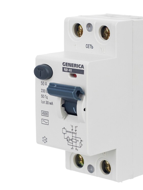 Быстродействующий защитный выключатель ВД1-63 (УЗО) GENERICA - устройство электронного типа, зависящее от напряжения и реагирующее на дифференциальный ток, без встроенной защиты от сверхтоков. Предназначен для защиты человека от поражения электрическим током.