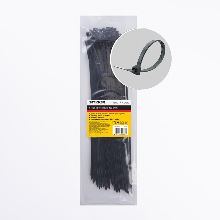 Хомут нейлоновый STEKKER NYCT47-350 4,7х350 мм, d пучка max 90 мм, нагрузка 22кг, черный, упаковка 100 шт