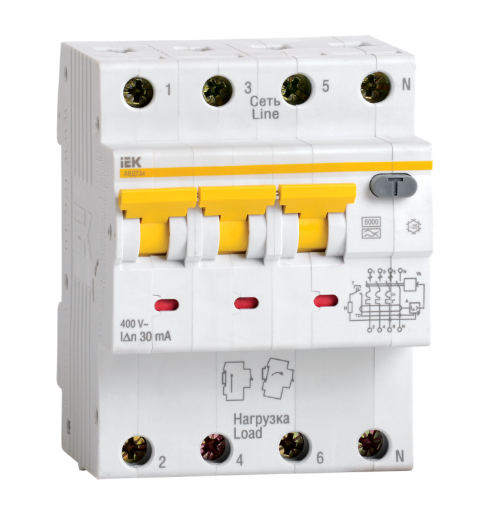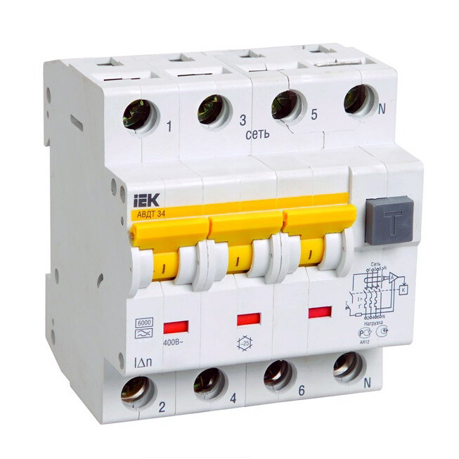 Автоматические выключатели дифференциального тока АВДТ34 предназначены для защиты человека от поражения электрическим током при повреждении изоляции электроустановок, для предотвращения пожаров вследствие протекания токов утечки на землю и для защиты от перегрузки и короткого замыкания в сетях переменного тока напряжением 400 В и частотой 50 Гц. АВДТ34 со встроенной защитой от сверхтоков реагируют не только на синусоидальные переменные дифференциальные токи, но и на пульсирующие постоянные дифференциальные токи. Источником пульсирующего тока являются, например, стиральные машины с регуляторами скорости, регулируемые источники света, телевизоры, видеомагнитофоны, персональные компьютеры и др. АВДТ34 выпускаются в четырехполюсном исполнении на номинальные токи 6, 10, 16, 20, 25, 32, 40, 50, 63 А и номинальные отключающие дифференциальные токи 10, 30, 100, 300 мА.