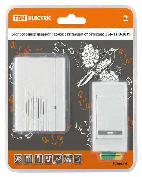 Применение:Используются в качестве дверных звонков или устройств внутреннего вызова. Преимущества:Бюджетное предложение на электротехническом рынке.Дальность работы беспроводных звонков 100-300 метров (на открытом пространстве).В ряде моделей имеется возможность разместить на кнопке номер квартиры и/или фамилию хозяина.В ряде моделей пользователь имеет возможность изменения кода звонка при порче/утере старой кнопки или для подключения дополнительной кнопки.В ассортименте имеются отдельно кнопки для проводных и беспроводных звонков, что позволит произвести замену при порче старой кнопки.Ряд моделей имеет кнопки со степенью защиты IP44, которые можно устанавливать на улице.Имеются исполнения с 2-мя кнопками (для разных выходов из дома) и с 2-мя звонками (для разных этажей или зданий: дом, гараж).Звонки упакованы в яркую блистерную упаковку, оформленную в корпоративных цветах TDM ELECTRIC, на каждом блистере есть информационные пиктограммы с характеристиками звонков.0: Применение:Используются в качестве дверных звонков или устройств внутреннего вызова. Преимущества:Бюджетное предложение на электротехническом рынке.Дальность работы беспроводных звонков 100-300 метров (на открытом пространстве).В ряде моделей имеется возможность разместить на кнопке номер квартиры и/или фамилию хозяина.В ряде моделей пользователь имеет возможность изменения кода звонка при порче/утере старой кнопки или для подключения дополнительной кнопки.В ассортименте имеются отдельно кнопки для проводных и беспроводных звонков, что позволит произвести замену при порче старой кнопки.Ряд моделей имеет кнопки со степенью защиты IP44, которые можно устанавливать на улице.Имеются исполнения с 2-мя кнопками (для разных выходов из дома) и с 2-мя звонками (для разных этажей или зданий: дом, гараж).Звонки упакованы в яркую блистерную упаковку, оформленную в корпоративных цветах TDM ELECTRIC, на каждом блистере есть информационные пиктограммы с характеристиками звонков.