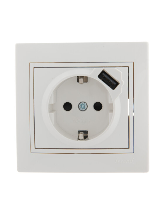 Lezard Мира белый с бел.вст. Розетка с/з 16A с USB 2.1A 1/10/120