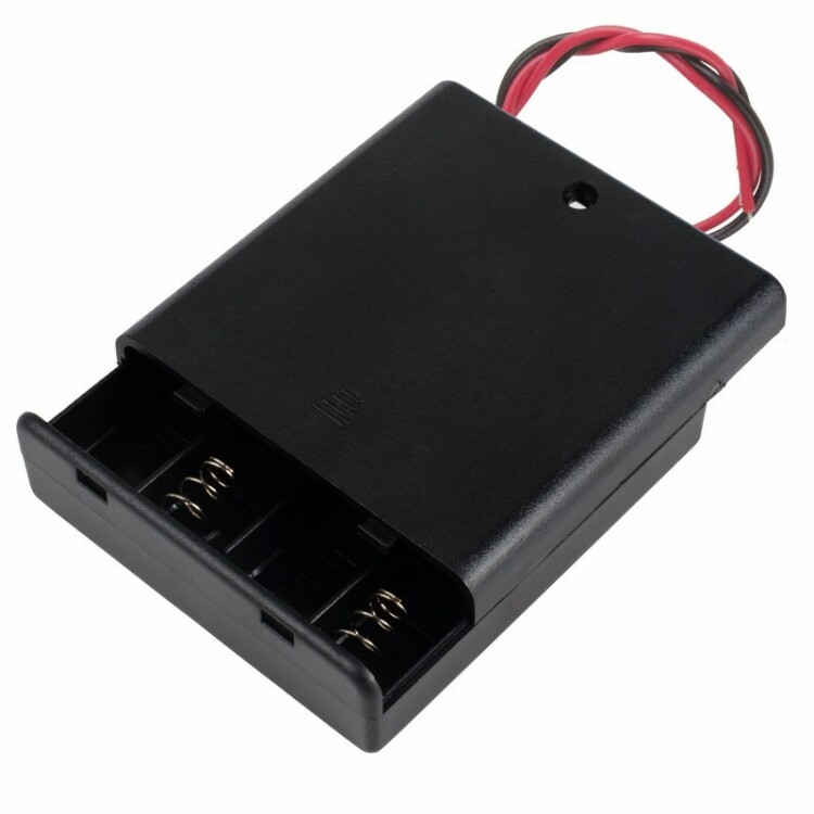 Батарейный отсек (держатель батареек) закрытого типа для четырех батарей типоразмера АА с контактными проводами предназначен для подключения питания в различном оборудовании (в том числе, в бытовых устройствах, игрушках и радиоуправляемых моделях). В целях ускорения и удобства монтажа держатель выполнен с двумя проводами (красного и черного цвета) длиной по 15 см, т.е. не требует пайки контактов. Окончания проводов подготовлены для дальнейшего монтажа: зачищены и облужены оловом. Суммарное напряжение при использовании 4-х батареек на 1.5 В -составит 6 В.Технические характеристики:• Количество элементов: 4• Тип устанавливаемых элементов: АА - «пальчиковая батарейка»• Корпус: закрытый c выключателем (OFF-ON)• Материал: АБС пластик• Цвет: черный• Габаритные размеры: 68 х 64 х 18 мм (подробнее см. схему)• Контакты: провод красный (+) 150 мм, провод черный (-) 150 мм• Сечение провода: 0.13 кв. мм (AWG26)• Температурный диапазон: -40° до +105°C