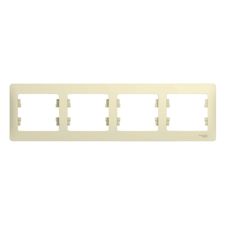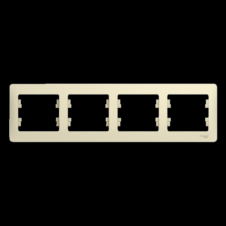 Рамка Systeme Electric (ранее Schneider Electric) серии Glossa (цвет бежевый) четырёхместная. Устанавливается в горизонтальном положении. Выполнена из материала PС+ASA, стойкого к УФ-излучению и появлению царапин. Позволяет гармонично вписать электроустановочное изделие в интерьер помещения.