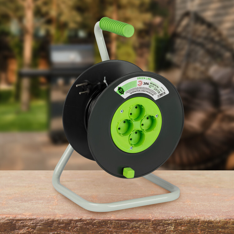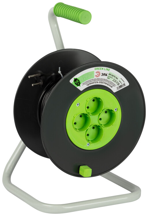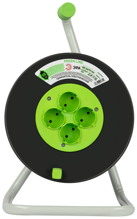Удлинитель силовой ЭРА GREEN LINE на пластиковой катушке KAT-2x0.75-15m, 4 розетки без заземления. Провод ПВС 2х0,75мм2, 15м. Мощность 6А/1300Вт. Используется для работы на строительных площадках или дачных участках. Удобен при работе с приборами, находящимися удаленно от стационарной розетки. Например, газонокосилки, электрические, пилы, триммеры или электродрели. Рама катушки сделана из высокопрочной стали, а пластиковой корпус катушки выполнен с применением негорючих добавок.