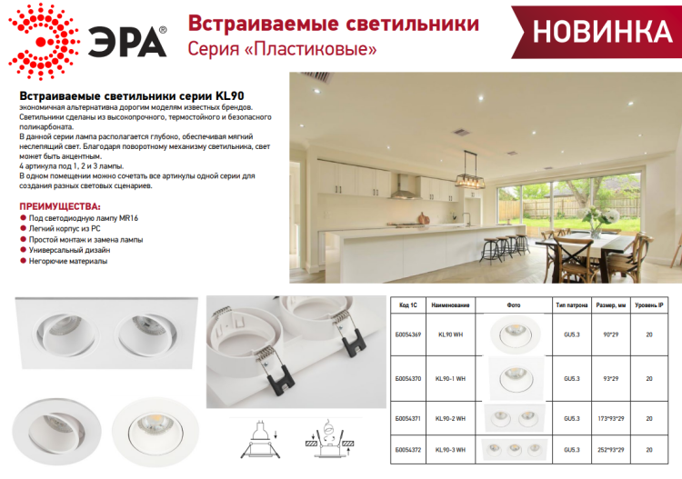 Светильник встраиваемый KL90-2 WH MR16/GU5.3 - замечательное решение для любой комнаты в вашем доме. Точечные светильники можно использовать как в качестве основного освещения, так и для создания акцентов в определенных зонах комнаты. Благодаря скрытой части корпуса светильники можно встраивать не только в потолок, но и в стены, создавая разный стиль помещений. Светильник ЭРА с приятным дизайном подойдет для комнат с разным интерьером: от лофта до модерна, классицизма или минимализма. При помощи точечных светильников можно освещать только те участки помещения, которыми вы пользуетесь в данный момент, не затрачивая лишнюю электроэнергию. Максимальная мощность лампы составляет 11 Вт. Корпус встраиваемого светильника изготовлен из термостойкого пластика, что делает его особенно удобным и надежным в использовании. Диаметр отверстия, требуемого для установки светильника составляет 80x160 миллиметров, а размер корпуса светильника – 173x93x29 миллиметров. Цоколь под лампу GU5.3 входит в комплект. Купив точечный светильник бренда ЭРА, вы останетесь довольны и сможете создать приятную атмосферу и уют в Вашем доме. Внимание: лампа не входит в комплектацию.