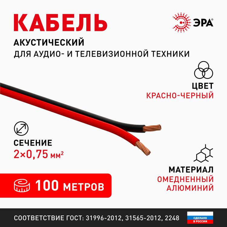 Акустический кабель Эра служит для передачи звукового сигнала в различных аудио системах.Широко применяется для подключения акустических инсталляций в торговых центрах, аэропортах, гостиницах, отелях, системах безопасности и просто не заменим при подключении домашних и автомобильных аудио систем. Конструкция кабеля в разрезе напоминает цифру восемь, два параллельных многожильных проводника покрытых изоляционным слоем из высоко качественного поливинилхлоридного пластиката соединённых между собой. Такая конструкция позволяет разделять проводники между собой без повреждения изоляционного слоя. Проводники выполнены из тонких алюминиевых жил покрытых слоем высокоочищенной бескислородной меди скрученных между собой.Акустический кабель ЭРА обладает высокими показателями придачи звукового сигнала, повышенной гибкостью и устойчивость к притиранию, сочетает в себе высокое качество по приемлемой цене.