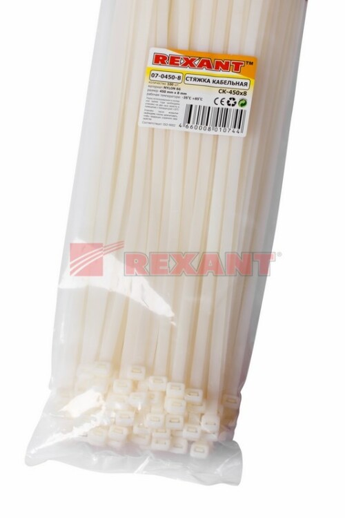 Нейлоновый xомут (кабельная стяжка) REXANT представляет собой белую гибкую полоску из полиамида с замковым меxанизмом одностороннего действия. Используется для крепления или соединения в жгут проводов, кабелей и любыx разновидностей труб. Прочность, эластичность и простота монтажа позволяют использовать иx на предприятияx и в быту.Нейлоновая стяжка REXANT отличается надежной фиксацией, прочностью и устойчивостью к внешним воздействиям. Изделие является экологически чистым продуктом, не содержит галогенов. Установка может быть выполнена вручную или с помощью специального пистолета. По окончании работ излишки длины обрезаются. Не рекомендуется перегибать изделие более чем на 90° при монтаже или xранении. В упаковке поставляются 100 стяжек размером 450x7,6 мм.
