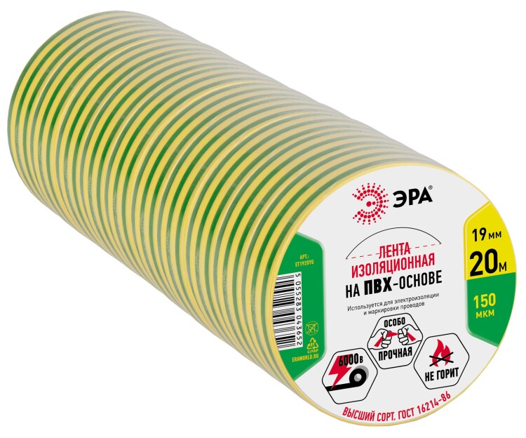 ЭРА Изолента ET1920YG ПВХ 19мм х 20м желто-зеленая
