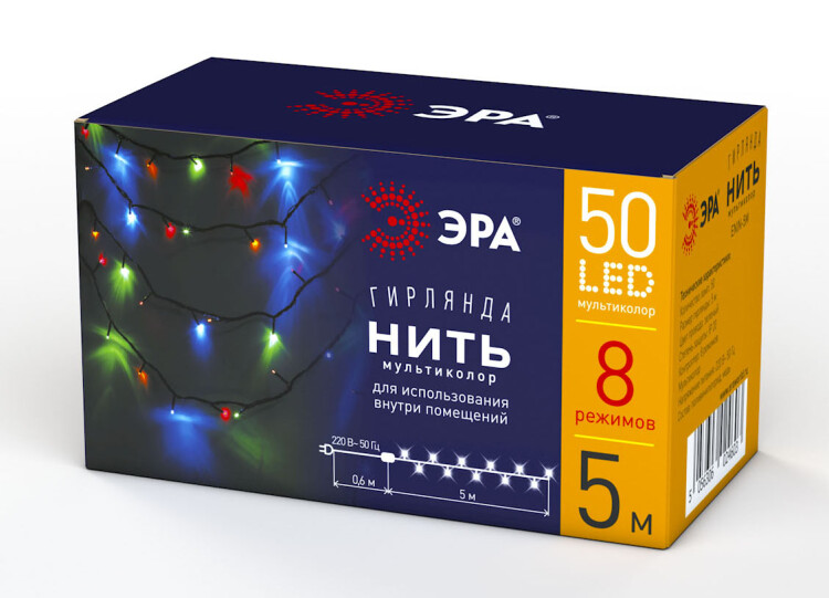 Разноцветная новогодняя гирлянда ЭРА "Нить" (арт. Б0041892) с 50 яркими светодиодами. Универсальный вариант праздничной иллюминации для дома, офиса, общественного пространства. Гирлянда работает от стандартной электросети 220 В и потребляет минимум электроэнергии за счёт использования современной LED-технологии. Лампы не нагреваются даже при длительной непрерывной работе гирлянды. Дли на световой части - 5 метров, расстояние от вилки до первого источника света - 0,6 м. В зависимости от атмосферы праздника выбирайте любой из 8 режимов свечения. Эта гирлянда подойдёт и для тихого вечера в семейном кругу и для шумной танцевальной вечеринки