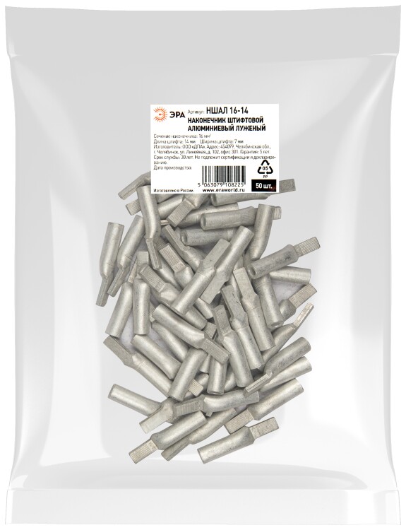 Наконечник штифтовой алюминиевый ЭРА НША 16-14 используется для оконцевания проводов и кабелей с алюминиевыми жилами сечением до 16 мм² и применяется для кабелей напряжением до 1 кВ. Позволяют осуществлять подключение кабелей и проводов, сечение жил которых превышает размеры контактных клемм. Предназначено для присоединения алюминиевых жил кабелей и проводов к выводам автоматических выключателей и других электрических устройств с ограниченным размером контактной клеммы. С помощью штифтовых наконечников ЭРА можно подключить алюминиевую жилу провода СИП непосредственно к электротехническим устройствам. Наконечники НШАЛ изготавливаются из электротехнического алюминия марки АД1. Для оконцевания проводников необходимо использовать специальный обжимной инструмент.