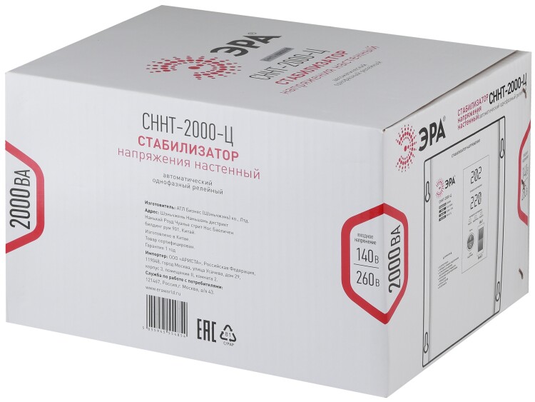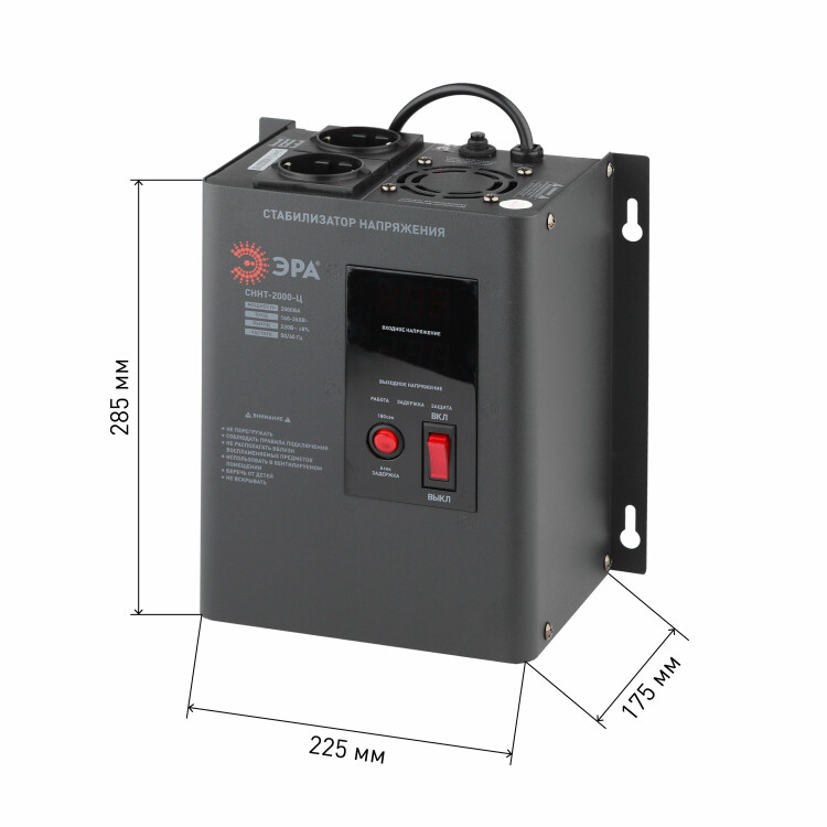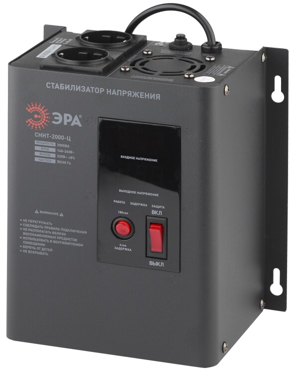 Стабилизатор напряжения настенный однофазный релейный цвет чёрный модели СННТ-2000-Ц. Номинальные характеристики (полная мощность / диапазон входного напряжения): 2000ВА 140-260В . Предназначен для поддержания стабильного однофазного напряжения питания бытовых приборов при отклонениях значений сетевого напряжения. Выбирая стабилизатор, нужно знать, какое электрооборудование будет к нему подключено: один прибор, группу приборов (наиболее чувствительных к перепадам напряжения в сети) либо вся домашняя (офисная) техника. Затем необходимо рассчитать суммарную мощность защищаемых электропотребителей. Основное условие выбора мощности стабилизатора напряжения - суммарная мощность подключаемой к нему нагрузки не должна превышать полной мощности самого стабилизатора (в противном случае автоматика стабилизатора будет их просто отключать). Точные значения мощности можно узнать из паспортных данных Вашего конкретного потребителя. Стабилизатор подбирается с запасом в 25-30% к его полной мощности.
