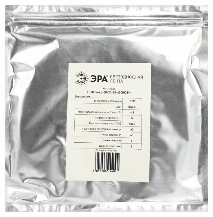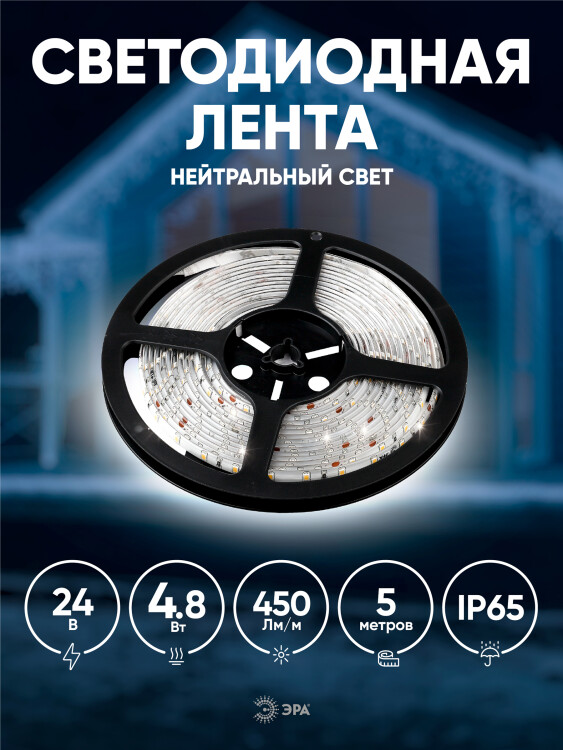 ЭРА Лента светодиодная LS2835-4,8-60-24-65-4000К-5m (50/800) со степенью защиты от пыли и влаги IP65 - современный способ создания внутреннего освещения, подсветки ниш, лестничного пространства, систем хранения, а также декоративного и художественного оформления любых объектов и форм в помещениях с повышенным уровнем влажности и уличного освещения. Легко и быстро устанавливается на любой гладкой поверхности с помощью скотча, расположенного на оборотной стороне ленты Используя алюминиевый профиль, можно создавать необычные и функциональные решения освещения в Вашем интерьере. Рабочее напряжение ленты составляет 24В, а мощность равна 4,8 Вт/м. Светодиодная лента обладает световым потоком 450 Лм/м, и цветом свечения - дневной белый (4000 К)