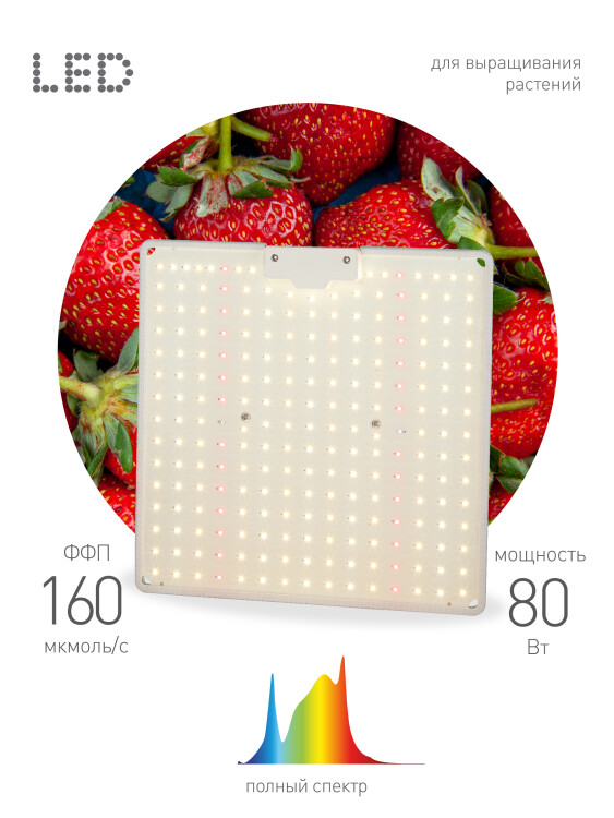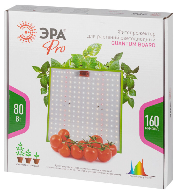 Фитопрожектор для растений светодиодный ЭРА FITO-80W-LED-QB подвесной Quantum Board полного спектра, мощность — 80 Вт. Входит в профессиональную линейку ЭРА для выращивания растений в гидропонике, гроубоксах. Печатная плата со светодиодами надёжно защищена от попадания плаги, паров удобрений и прочих активных компонентов — специальным кремнийорганическим покрытием. Квантумборд может использоваться как для стеллажных отделений (для проращивания семян), так и для взрослых растений — в спектре присутствуют все длины волн, необходимые для фотоморфогенеза и фотосинтеза.