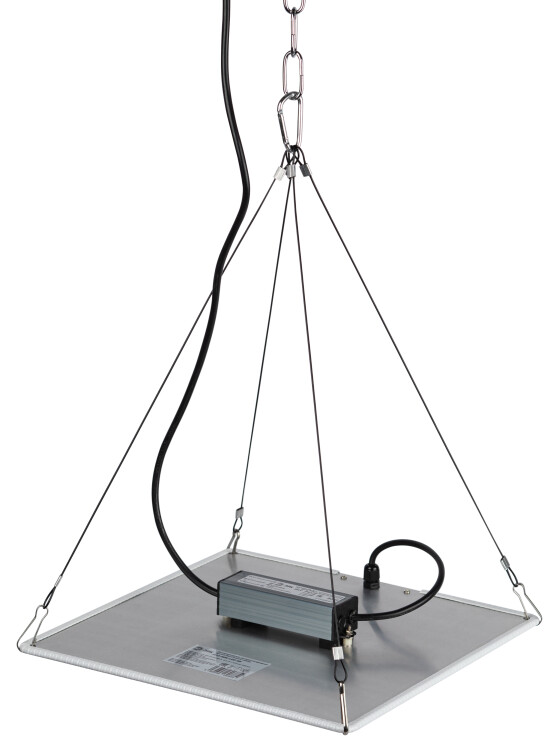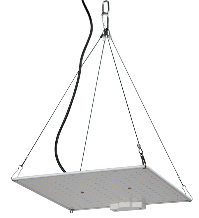 Печатная плата работает в дефорсированном режиме, ток на светодиодах уменьшен от номинального в два раза, в связи с этим удаётся достичь заявленной эффективности в 2 мкмоль/Вт*с. Прожектор оснащён тросовой системой подвеса, вилкой на проводе 1,5 м и выключателем.