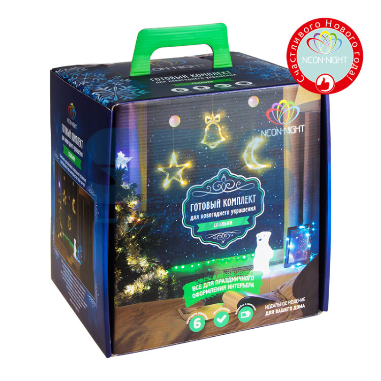 Не секрет, что самое хлопотное время в году - предновогоднее. Люди тратят массу времени и сил на поиск подарков для своих родных, близких, коллег и друзей. Подчас просто не остается времени на украшение дома и создание того самого желанного предновогоднего настроения. Специально для Вас мы разработали готовые решения для оформления каждой комнаты в доме, что значительно упростит процесс поиска и подбора украшений. Каждый из комплектов по-своему уникален, он содержит различные цветовые решения, которые подойдут для любого интерьера. Спальня – место, где мы отдыхаем после трудовых будней и насыщенных выходных. Место, где хочется спокойствия и гармонии. Для большего комфорта мы использовали гирлянды и фигурки с постоянным цветом свечения. В комплект мы включили: • Универсальную интерьерную гирлянду «Роса» длиной 2м. Ее часто используют декораторы для украшения цветочных композиций и не только, так как сама гирлянда не боится воды (кроме батарейного блока, который можно спрятать за вазой). • Три большие