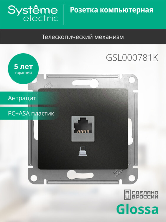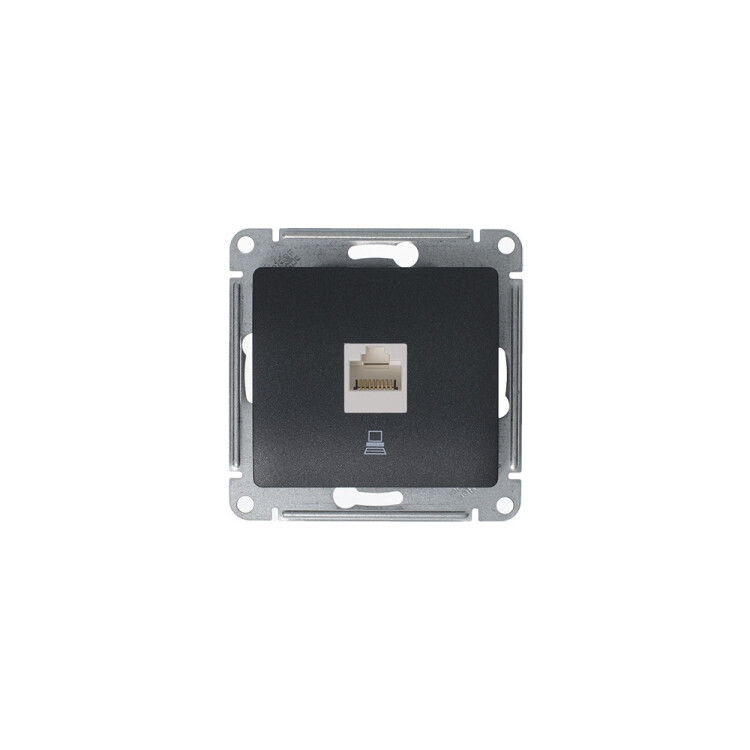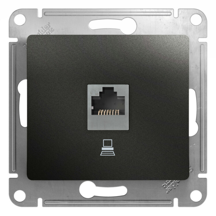 Механизм Systeme Electric (ранее Schneider Electric) серии Glossa (цвет антрацит) розетки компьютерной с разъёмом RJ45 категория 5е предназначен для удобного и быстрого подключения вашего компьютера к компьютерной сети. Выполнен из материала PС+ASA, стойкого к УФ-излучению и появлению царапин.