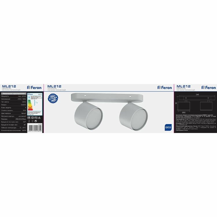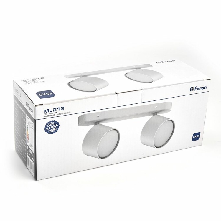 Светильник накладной под лампу, (ИВО) FERON ML212, 2*GX53 2*15 W, 230V, IP20, цвет белый, корпус алюминий, 240*80*92