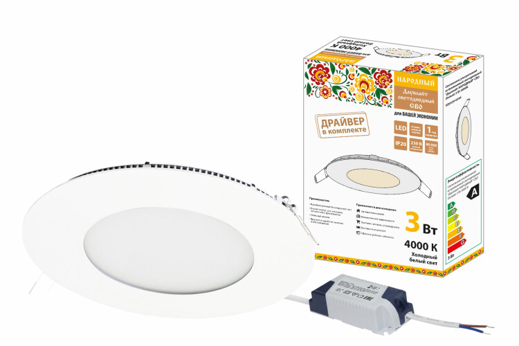 TDM Светильник ультратонкий встраиваемый светодиодный "Даунлайт НАРОДНЫЙ" СВО (белый) 3 Вт 4000К.
