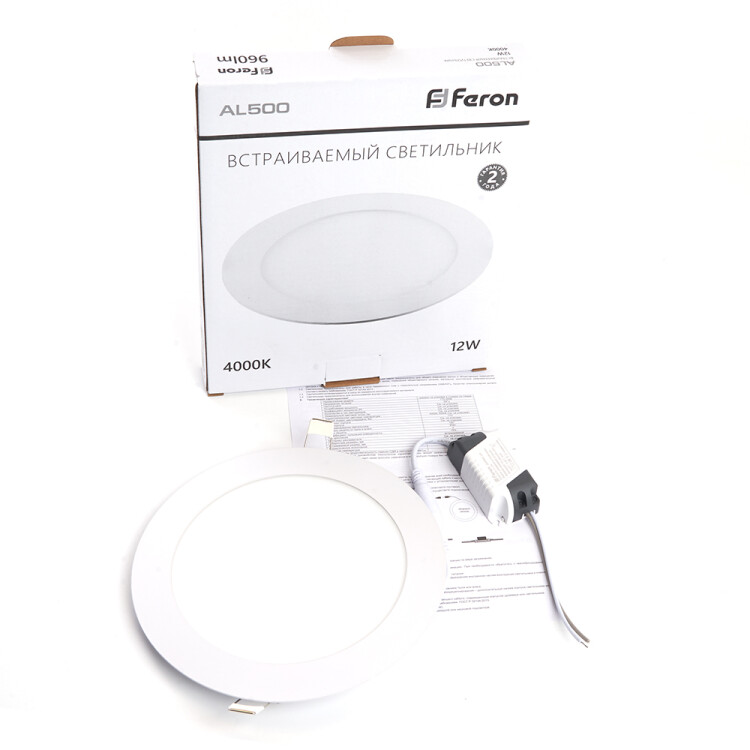 Светильник встраиваемый светодиодный, ультратонкий (ДВО) FERON AL500, 12W 4000К (белый), 175-265V, 960Lm, IP40, угол рассеивания 120°, цвет белый, корпус алюминий, рассеиватель матовый акриловый полимер, 170*170*18 мм, монтажн.отв. 155*155 мм.