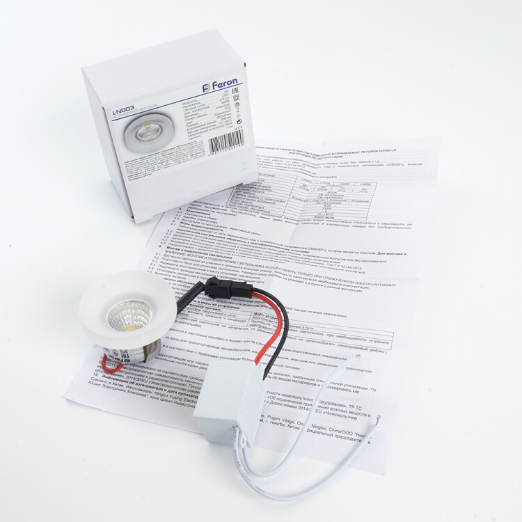 Светильник встраиваемый светодиодный, для подсветки мебели (ДВБ) FERON LN003, 3W 4000К (белый), 230V, 210Lm, IP20, цвет прозрачный, корпус алюминий, рассеиватель акриловый полимер, 45*45*29 мм, монтажн.отв. 40 мм.