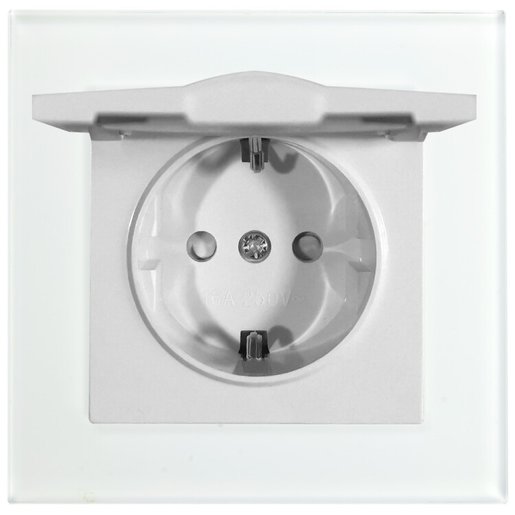 Розетка STEKKER GLS16-7012-01 (IP44 при закрытой крышке) на 1 гнездо, с крышкой, с заземлением. Материал: Закаленное стекло, ABS пластик, полипропилен, латунь, цвет белый, размер 84*84*35мм. Номинальное напряжение 250, номинальный ток 16А, диапазон рабочих температур 0..+35°C, IP20