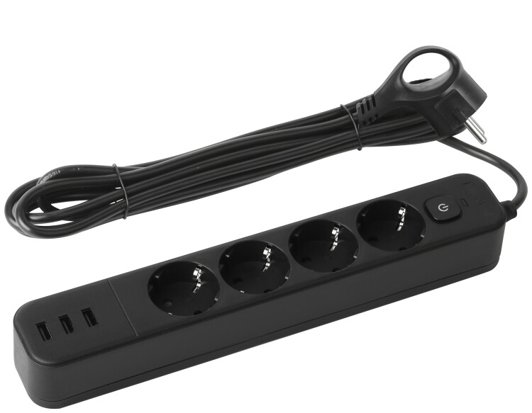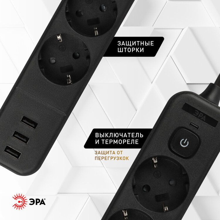 Сетевой фильтр ЭРА USF-4es-3m-3xUSBA-B с заземлением, с выключателем, 4 розетки, 3USB, провод 3м, ПВС 3x0,75мм2. Базовый уровень защиты техники: от импульсных помех, от перегрузки, от короткого замыкания. Максимальная мощность 10А/2200 Вт. Корпус из негорючего пластика (полипропилен). Вилка обеспечена кольцом для удобного извлечения ее из розетки. Выключатель со световой индикацией позволяет выключит ь все приборы, подключенные к сетевому фильтру, не вынимая вилки из розетки. Отлично подойдет для защиты бытовой и компьютерной техники. Сетевой фильтр оснащен 3USB для зарядки мобильных устройств.