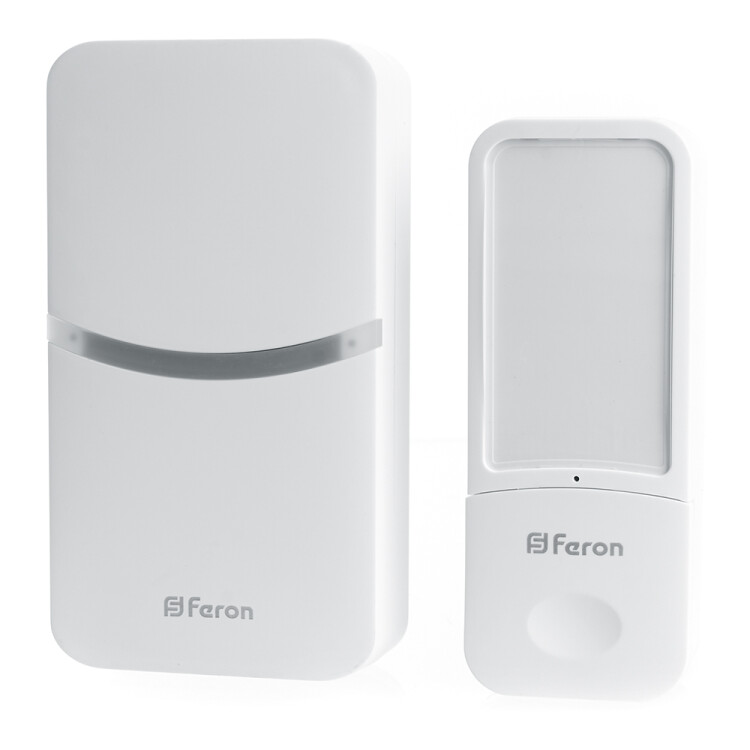 Звонок электрический дверной беспроводной FERON DB-100, 18 мелодий, цвет белый, регулировка громкости - есть, шифрование сигнала - есть; 107*58*70 мм, КНОПКА: IP44, раб.t -20..+60°С , размер кнопки 37*22*94мм