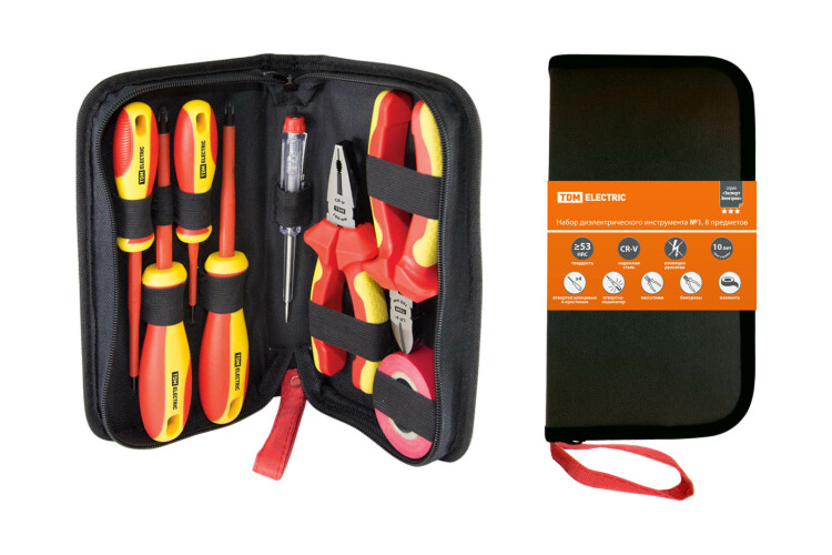 Материалы:Диэлектрический пластик VDEРезина TPRХром-ванадиевая сталь CR-V Преимущества:Особая заточка режущих частей кусачек и пассатижей. Закалка токами высокой частоты. Диэлектрические свойства изоляционного материала соответствуют стандарту VDE.Намагниченный наконечник у отверток. Компактные размеры чемодана и пенала.Назначение:Проведение любых слесарных и электромонтажных работ под напряжением до 1000 В. 0: Материалы:Диэлектрический пластик VDEРезина TPRХром-ванадиевая сталь CR-V