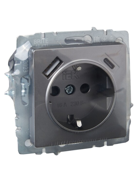IEK BRITE BASE Сталь Розетка с з/к/ш 16А с USB A+C 18Вт РЮш11-1-БрС