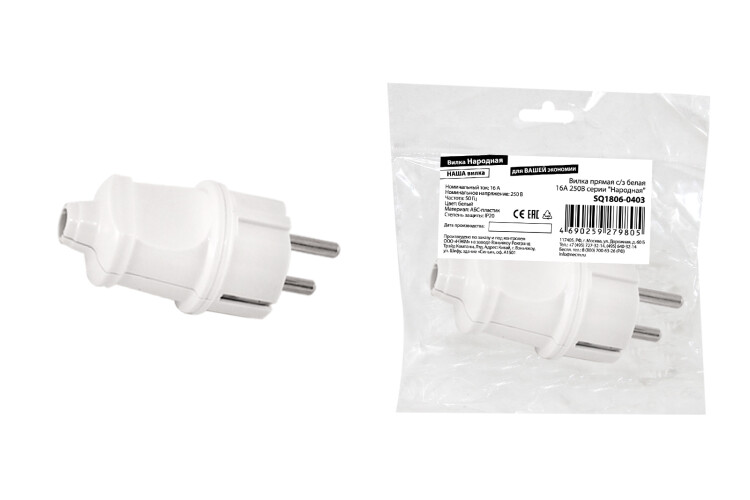 TDM Вилка прямая с/з белая 16А 250В серии "Народная"