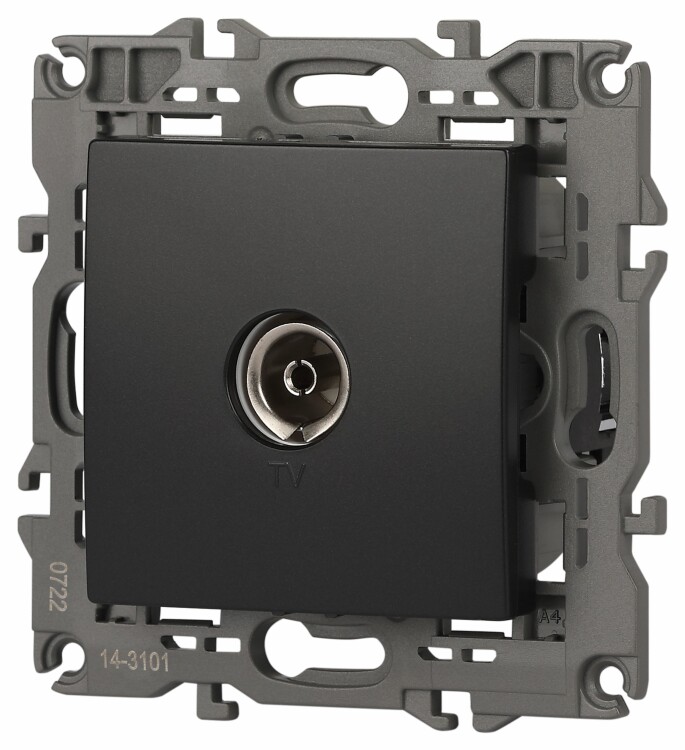 Розетка телевизионная одиночная серии Эра Elegance цвет антрацит 14-3101-05. Рамки приобретаются отдельно. Рамки Эра Elegance ПЛАСТИК: 1 пост 14-5001-хх, 2 поста 14-5002-хх, 3 поста 14-5003-хх, 4 поста 14-5004-хх, 5 постов 14-5005-хх; СТЕКЛО: 1 пост 14-5101-хх, 2 поста 14-5102-хх, 3 поста 14-5103-хх, 4 поста 14-5104-хх; МЕТАЛЛ: 1 пост 14-5201-хх, 2 поста 14-5202-хх, 3 поста 14-5203-хх, 4 поста 14-5204-хх; ДЕРЕВО: 1 пост 14-5301-хх, 2 поста 14-5302-хх, 3 поста 14-5303-хх, 4 поста 14-5304-хх (хх - код цвета: 00-прозрачный, 01-белый, белёный дуб, 02-слоновая кость, 03-алюминий, 04-шампань, 05-чёрный, чёрное дерево, 07-ясень, 09-дуб, 10-венге, 11-клён, 14-медь, 21-жёлтый, 22-оранжевый, 23-красный, 25-бордо, 26-лайм, 27-зелёный, 28-голубой, 29-синий, 30-розовый, 31-мокко, 32-серый, 41-сталь, 42-титан).