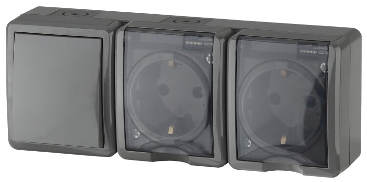 ЭРА Блок две розетки + выключатель Эксперт 11-7403-03 IP54 16A-10AX-250В ОУ серый