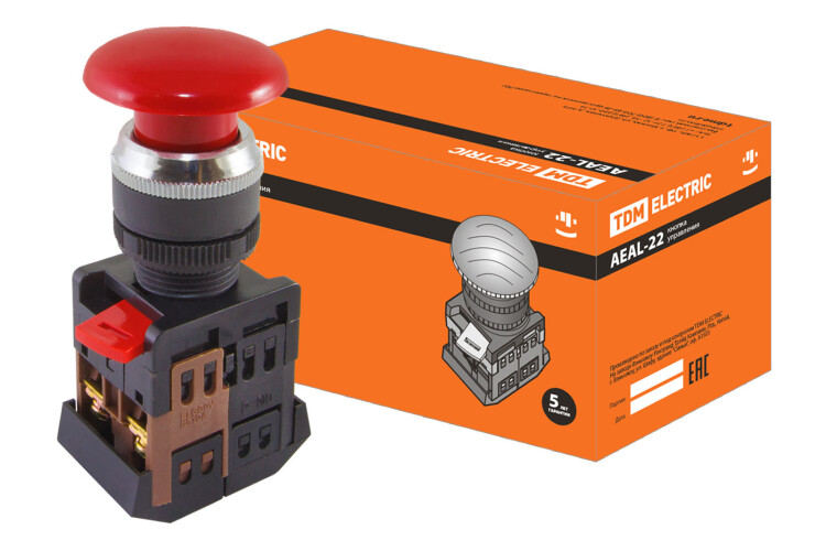 TDM Кнопка AEAL-22 "Грибок"с фиксацией красный d22мм 230В 1з+1р