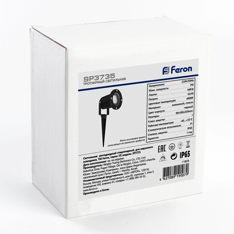 Тротуарный светильник GU10, на колышке (ДВУ) FERON SP3735, 7W, 4000К (натуральный белый), 230V/50Гц, IP65, класс защиты 1, раб.t -40°C...+40°C, цвет черный, корпус металл, 100*98*320мм,