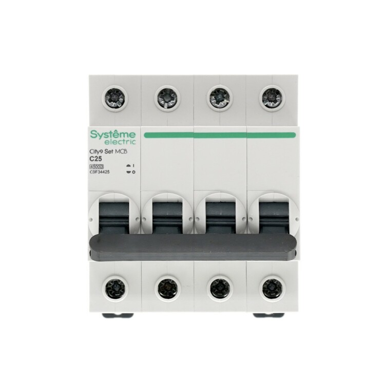 Автоматический выключатель серии City9 Set Systeme Electric, 4-полюсный, номинальный ток 25 А, характеристика С, Icn = 4.5 кА. Применяется в электрических сетях напряжением 400 В. Предназначен для защиты от перегрузок и токов короткого замыкания. Оснащен механизмом «мгновенной коммутации». Ударопрочный корпус из специального пластика с 6 металлическими заклепками. Безопасные клеммы исключают попадание кабелей в заклеммное пространство (ранее Schneider Electric EZ9F34425).