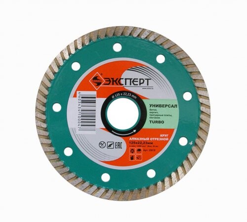 Наружный диаметр: 125 мм, Диаметр посадочного отверстия: 22,23 мм, Максимально допустимые обороты: 12900 об/мин, Максимальная окружная скорость: 80 м/с, Высота алмазоносного слоя: 8 мм, Толщина алмазоносного слоя: 2,2 мм, Материал применения основной: кирпич, бетон, мрамор