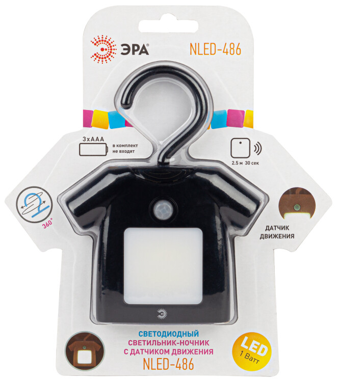 Удобный, красивый и функциональный светильник-ночник NLED-486-1W-MS-BK со светодиодами (LED), цвет - черный. С датчиком движения - включается при движении в зоне 2,5 м, выключается автоматически через 30 секунд после окончания движения. Дизайн корпуса ночника напоминает рубашку на вешалке. Светильник автономный, работает от элементов питания 3 х ААА (не входят в комплект поставки), есть крючок для подвеса с поворотом в любом направлении. Есть магнитное крепление - на металлических поверхностях держится без крюка. Также светильник-ночник можно просто поставить, он будет устойчиво стоять. Используйте где Вам удобно - можно повесить в шкаф для подсветки, в любое другое подходящее место, просто поставить, даже прикрепить на холодильник. Поменять батарейки очень легко. Поставляется в блистерной упаковке с евроотверстием.