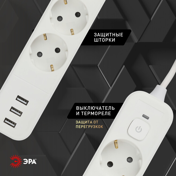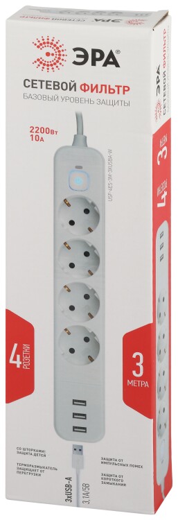 Сетевой фильтр ЭРА USF-4es-3m-3xUSBA-W с заземлением, с выключателем, 4 розетки, 3USB, провод 3м, ПВС 3x0,75мм2. Базовый уровень защиты техники: от импульсных помех, от перегрузки, от короткого замыкания. Максимальная мощность 10А/2200 Вт. Корпус из негорючего пластика (полипропилен). Вилка обеспечена кольцом для удобного извлечения ее из розетки. Выключатель со световой индикацией позволяет выключит ь все приборы, подключенные к сетевому фильтру, не вынимая вилки из розетки. Отлично подойдет для защиты бытовой и компьютерной техники. Сетевой фильтр оснащен 3USB для зарядки мобильных устройств.