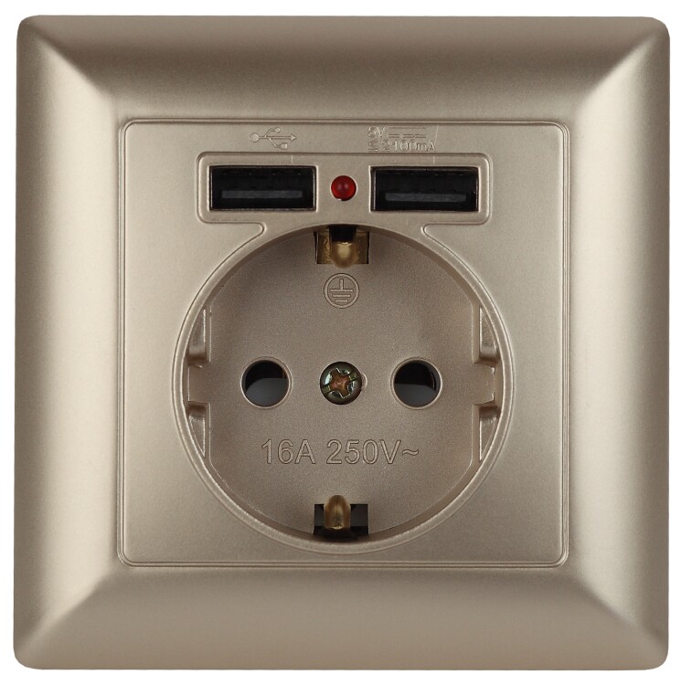 Розетка с USB со шторкой серии Intro Solo скрытой у становки цвет шампань 4-410-04. Номинальные характеристики 16А 250В/2,1А-5В . Розетка выполнена из негорючего термопласта, укомплектована одноместной рамкой, оснащена винтовыми клеммами. Клеммы с двумя отверстиями позволяют соединять соседние розетки шлейфом. Установка в подрозетник производится как на монтажные лапки, так и на винты.