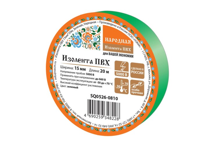 Изолента ПВХ 15мм*20м, Зеленая, Народная
