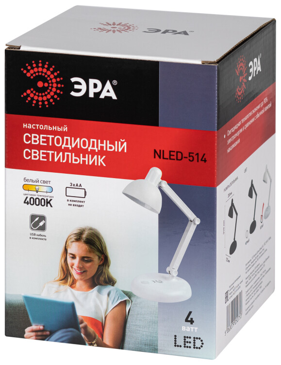 Настольный светильник NLED-514-4W-W со светодиода ми (LED) в качестве источников света. Работает от элементов 3 х АА (не входят в комплект поставки) или от USB.