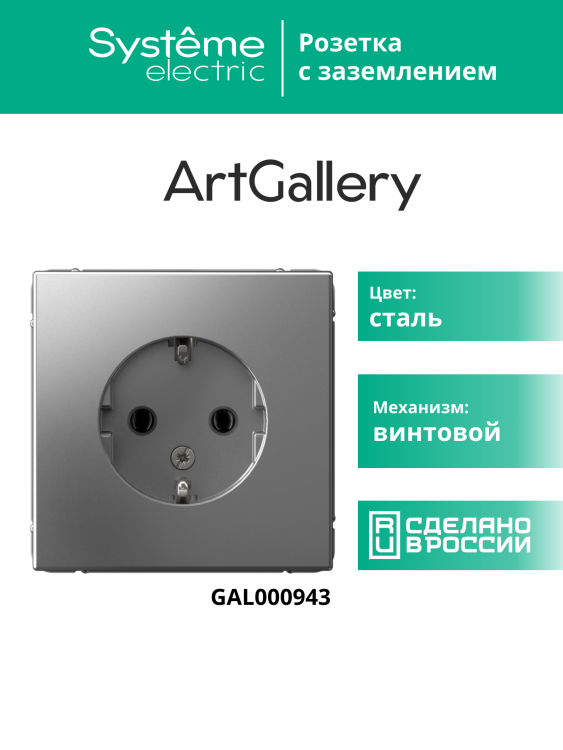 Механизм Systeme Electric серии ArtGallery в цвете сталь розетки одинарной с заземлением и без шторок подходит для сетей 250 В, на ток 16 А.