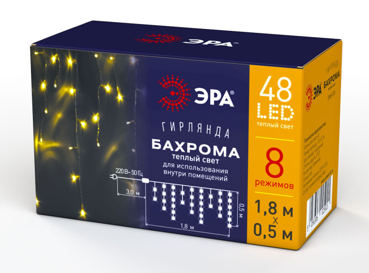 Новогодняя гирлянда ЭРА "Бахрома" с уютным теплым светом создаёт в доме неповторимую атмосферу праздника и волшебства. Благодаря прозрачному проводу складывается впечатление, что яркие огоньки висят в воздухе. Гирлянда состоит из 48 экономичных светодиодов последнего поколения - они не тускнеют со временем и тратят минимум электроэнергии. Работает гирлянда от стандартной электросети 220 В. Длина световой части - 1,8 м. Расстояние от начала иллюминации до вилки - 3 метра, что позволяет использовать эту практичную гирлянду на значительном расстоянии от сети. Светодиоды оригинально расположены на проводах разной длины, так формируется необычная многоуровневая подсветка. Дизайн гирлянды и её тёплый белый свет делают этот товар универсальным для любого времени года и любого торжества. А наличие 8 режимов позволяет выбирать именно то свечение, которое в данный момент подходит под настроение. Создавайте праздник вместе с ЭРА.