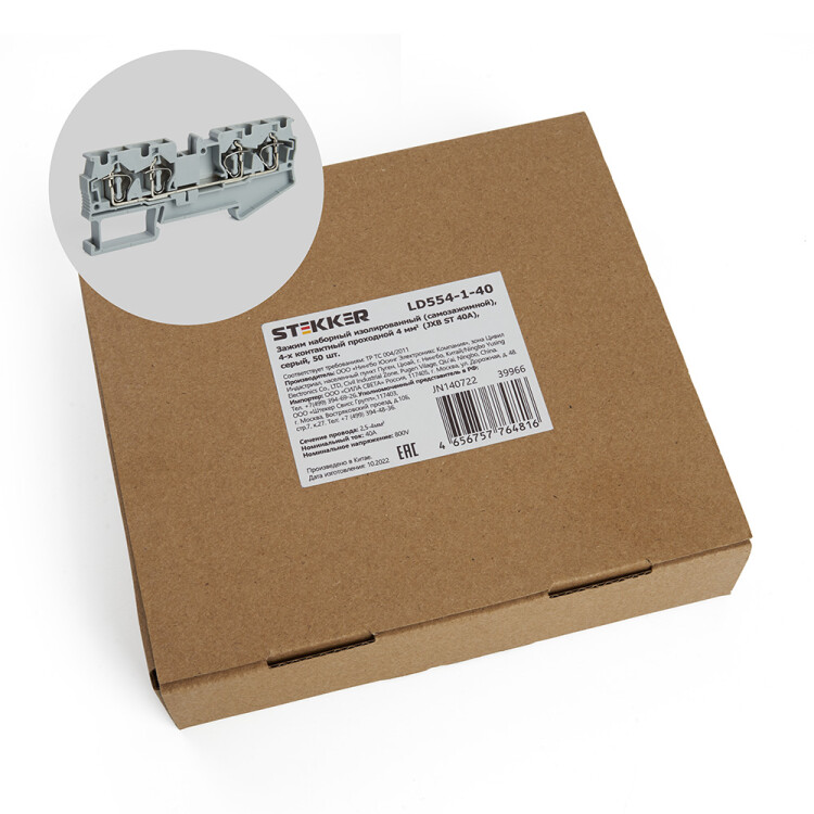 LD554-1-40 ЗНИ Зажим самозажимной, 4-проводной проходной 4,0 мм? (JXB ST 4), серый
