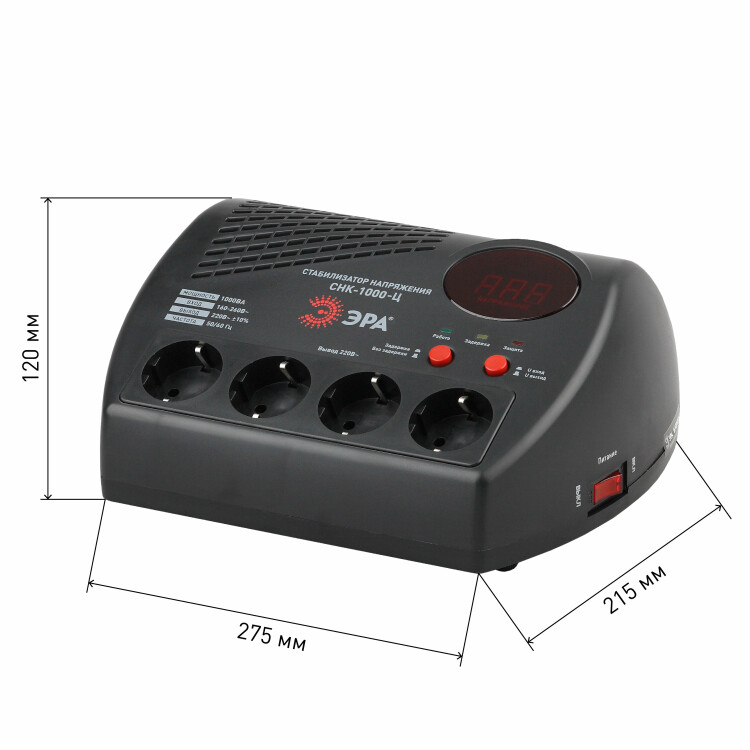Стабилизатор напряжения компактный однофазный релейный цвет чёрный модели СНК-1000-Ц. Номинальные характеристики (полная мощность / диапазон входного напряжения): 1000ВА 160-260В . Предназначен для поддержания стабильного однофазного напряжения питания бытовых приборов при отклонениях значений сетевого напряжения. Выбирая стабилизатор, нужно знать, какое электрооборудование будет к нему подключено: один прибор, группу приборов (наиболее чувствительных к перепадам напряжения в сети) либо вся домашняя (офисная) техника. Затем необходимо рассчитать суммарную мощность защищаемых электропотребителей. Основное условие выбора мощности стабилизатора напряжения - суммарная мощность подключаемой к нему нагрузки не должна превышать полной мощности самого стабилизатора (в противном случае автоматика стабилизатора будет их просто отключать). Точные значения мощности можно узнать из паспортных данных Вашего конкретного потребителя. Стабилизатор подбирается с запасом в 25-30% к его полной мощности.