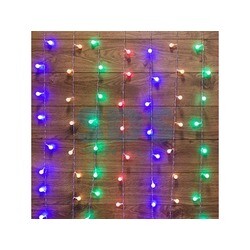 Гирлянда «Дождь» 1,5?1,5 м с матовыми насадками-шариками, каждый из которых имеет диаметр 18 мм, выполнена в виде занавеса на основе провода из прозрачного ПВХ. Украшение отлично подходит для оформления окон, стен, отдельных интерьерных объектов, ниш и свободного пространства между помещениями. 144 светодиода искрятся яркими разноцветными огнями. Степень защиты изделия — IP20, подходит для использования только внутри помещения. Гирлянда подключается в электросеть 230 В при помощи шнура питания длиной 3 метра.