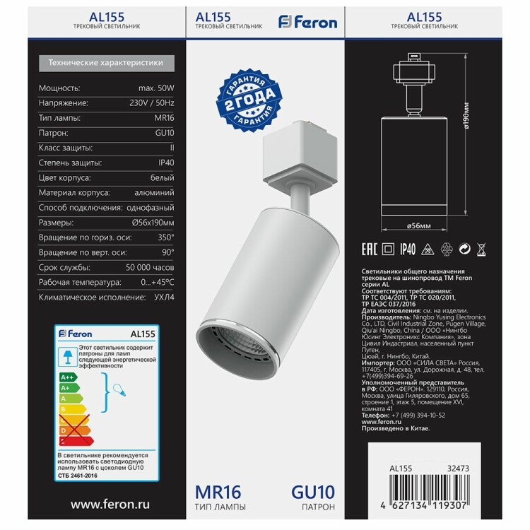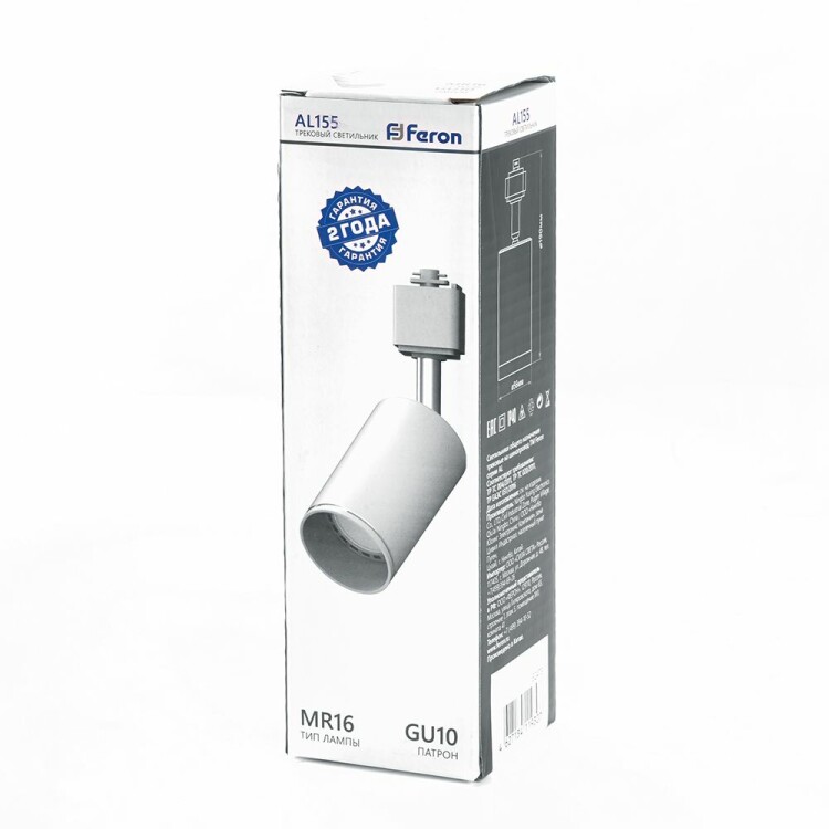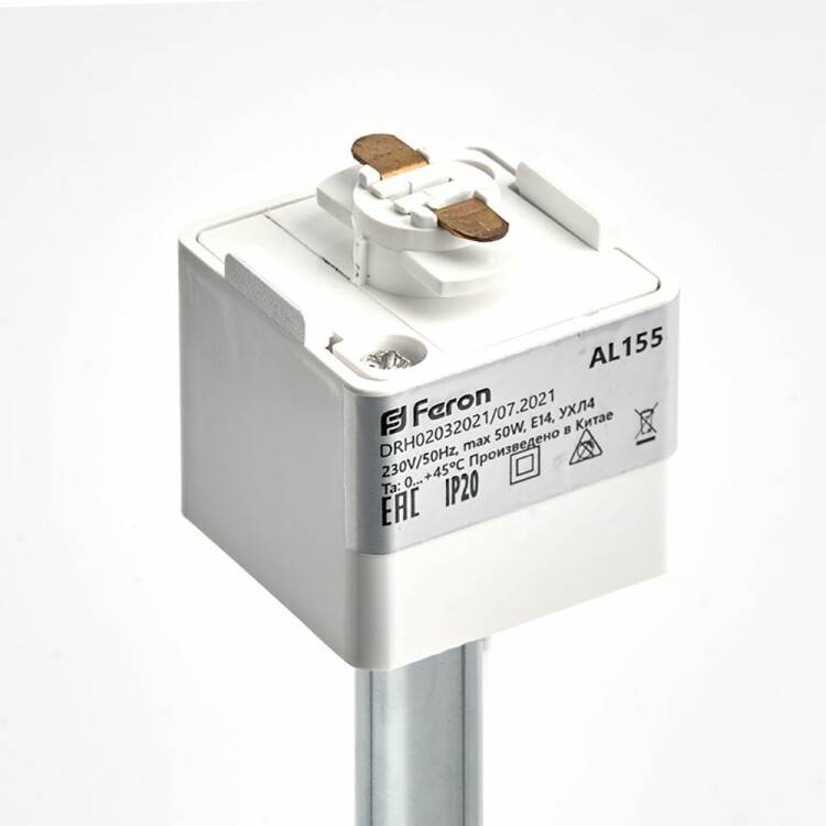 Светильники трековые на шинопровод GU10, однофазный (ИВО) FERON AL155, 50W, 230V, цвет белый, корпус алюминий, вращение →350°/↓90°, 56*56*190 мм