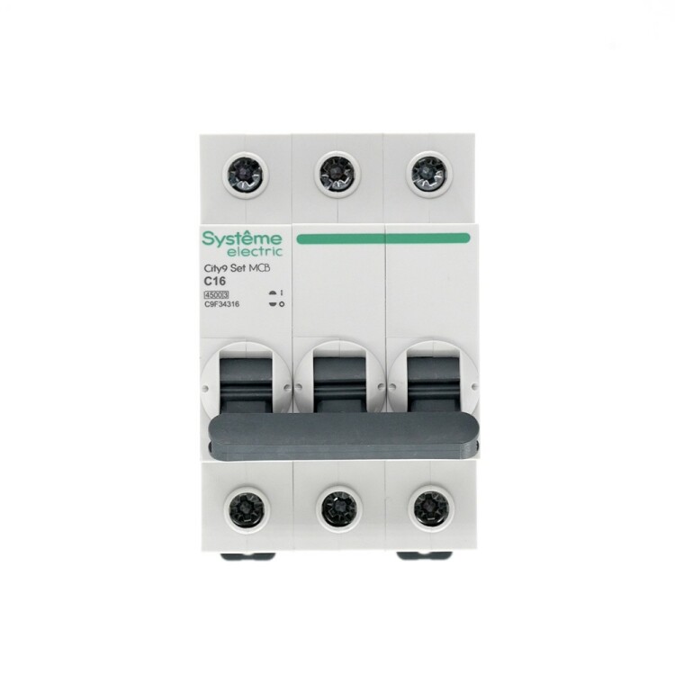 Автоматический выключатель серии City9 Set Systeme Electric, 3-полюсный, номинальный ток 16 А, характеристика С, Icn = 4.5 кА. Применяется в электрических сетях напряжением 400 В. Предназначен для защиты от перегрузок и токов короткого замыкания. Оснащен механизмом «мгновенной коммутации». Ударопрочный корпус из специального пластика с 6 металлическими заклепками. Безопасные клеммы исключают попадание кабелей в заклеммное пространство (ранее Schneider Electric EZ9F34316).