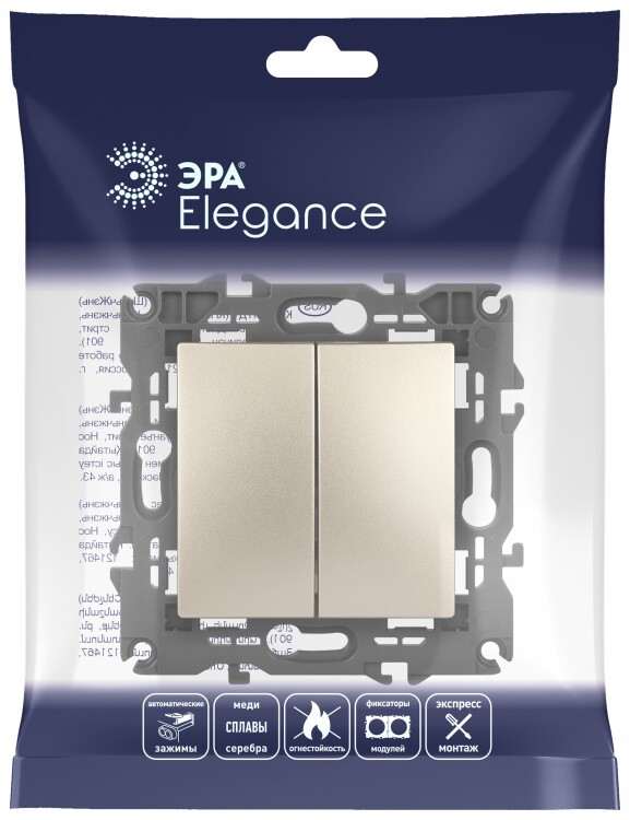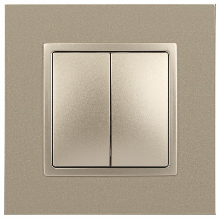 Выключатель 2-клавишный Эра Elegance шампань 14-1104-04. Оснащён автоматическими клеммами для надёжной фиксации жил кабеля в механизме. Рамки приобретаются отдельно.